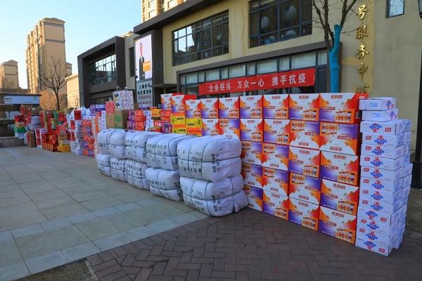 為支援一線防疫工作,陜建十三建集團(tuán)向延安新投物業(yè)服務(wù)有限公司捐贈(zèng)了8000只口罩、100件軍大衣,60箱方便面、60箱火腿腸、60箱奶茶和15箱榨菜。